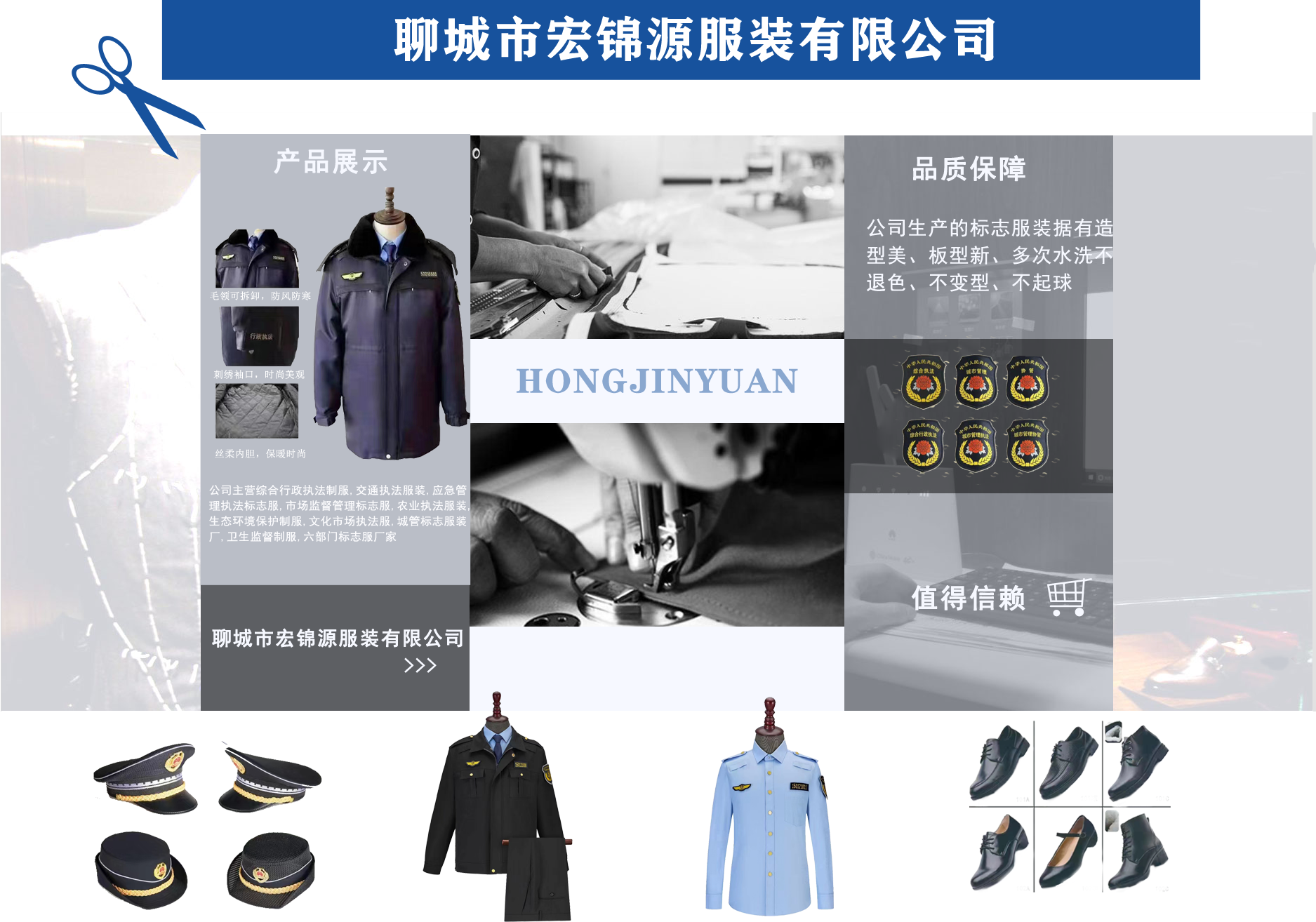 聊城市宏錦源服裝有限公司位于江北水城—山東聊城,地理位置優越,交通便利。公司主營綜合行政執法制服,交通執法服裝,應急管理執法標志服,市場監督管理標志服,農業執法服裝,生態環境保護制服,文化市場執法服,城管標志服裝廠,衛生監督制服,六部門標志服廠家等,值得信賴! 公司生產的標志服裝據有造型美、板型新、多次水洗不退色、不變型、不起泡。 “認真辦事,踏實做人”是宏錦源的企業精神,我們的宗旨是:“用服務與真誠來換取你的信任與支持,互惠互利,共創雙贏!”我公司愿與國內外各界同仁志士竭誠合作,共創未來企業目標:在已選定的服飾領域中,成為行業的卓越者?! 〗洜I理念:追求產品卓越,為用戶提供完美、高效的服務。...